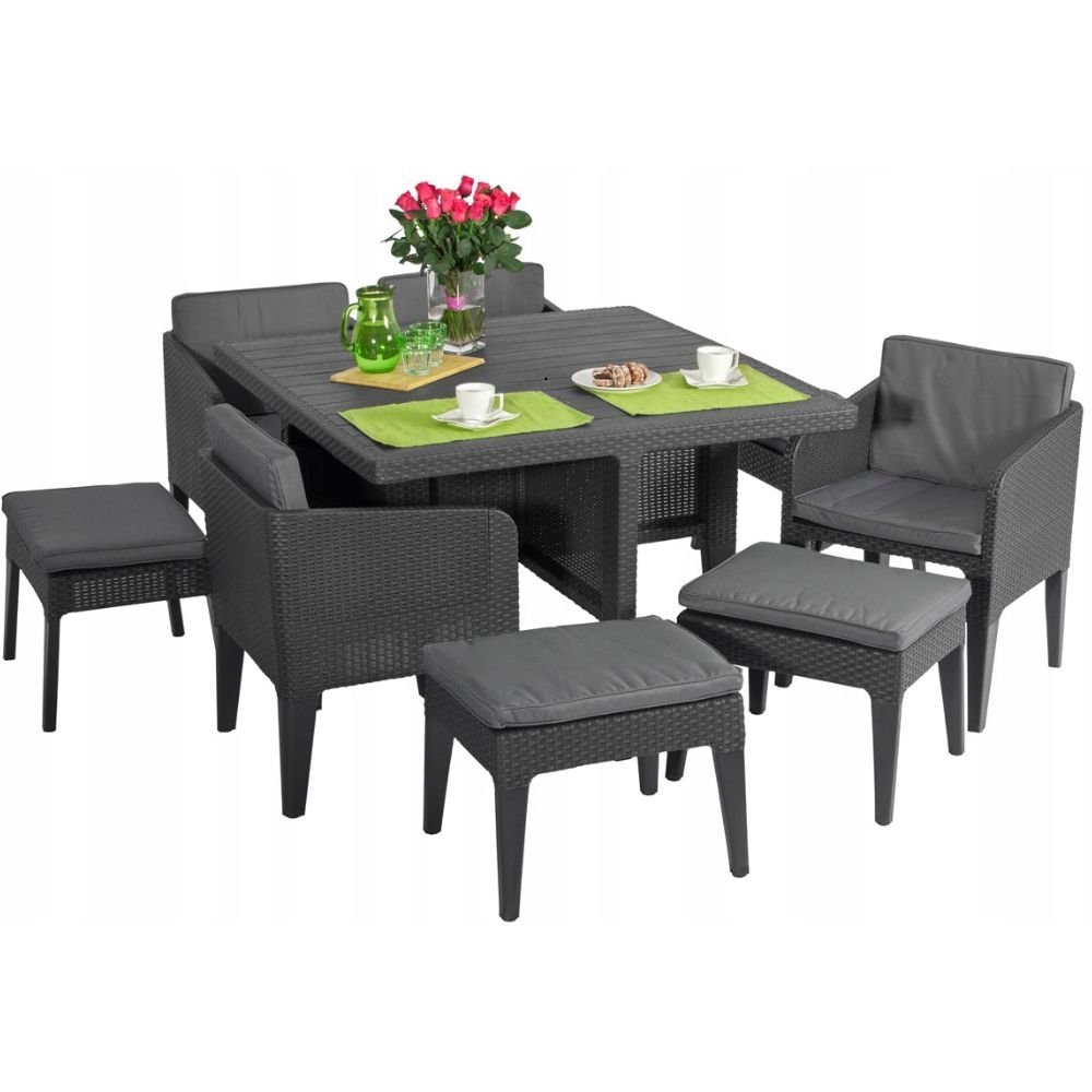 - Περιλαμβάνει: 1 τραπέζι, 4 πολυθρόνες με μαξιλάρια, 4 σκαμπό με μαξιλάρια