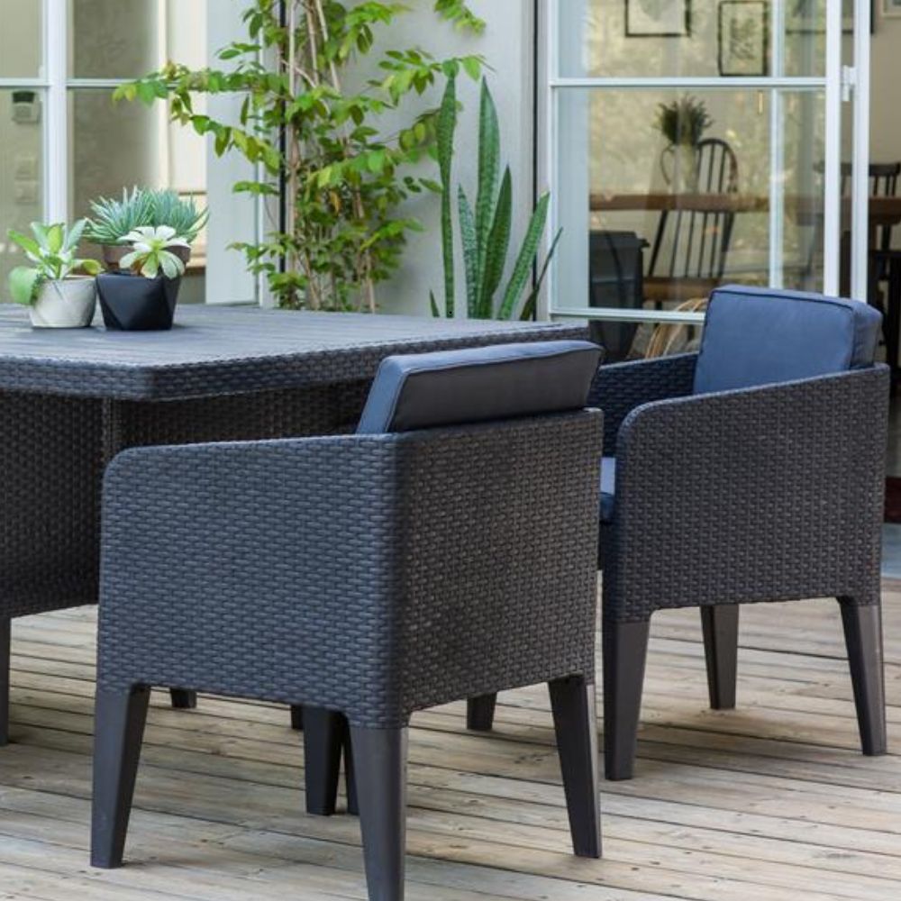 Το υλικό ρητίνης υψηλής ποιότητας προσφέρει ανθεκτικότητα σε νερό και ήλιο, διατηρώντας την εμφάνιση του σετ αναλλοίωτη στο χρόνο. Ο ρεαλιστικός σχεδιασμός με όψη rattan προσδίδει φυσικό χαρακτήρα, ενώ η δυνατότητα αποθήκευσης των καθισμάτων κάτω από το τραπέζι εξοικονομεί πολύτιμο χώρο όταν δεν χρησιμοποιούνται.